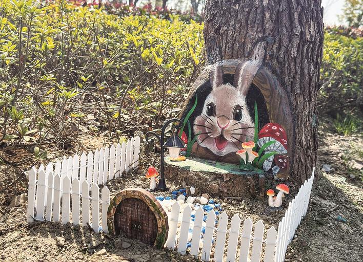 此次彩繪的主題為“洞繪生靈”,畫作之外,望山公園內(nèi)還設(shè)置了不少創(chuàng)意微景觀,抬頭可見“攀爬”的小松鼠,低頭可尋兔子的“小花園”(見下圖)。周添表示:“希望這些萌寵能給春日游玩的市民帶來驚喜。后續(xù),公司將根據(jù)實(shí)際情況向其他區(qū)域延伸作畫,美化環(huán)境的同時(shí)做好樹木修復(fù)工作,為創(chuàng)新區(qū)公園增彩添趣?!庇浾呱蚣逊f