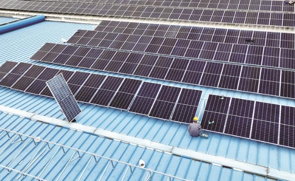 11日,工人在海安市孫莊街道海南村一企業(yè)的廠房屋頂安裝太陽能光伏發(fā)電板。近年來,海安市堅持綠色發(fā)展理念,引導企業(yè)利用廠房閑置屋頂建設分布式光伏發(fā)電站,采用“自發(fā)自用、余電上網”模式,助力綠色低碳發(fā)展和鄉(xiāng)村振興。 顧華夏攝