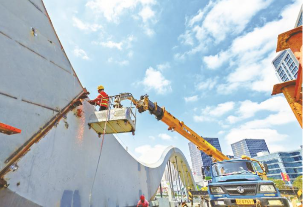 昨天,施工人員正在五龍匯片區(qū)的永昌路大橋橋面施工。永昌路大橋橫跨通揚(yáng)運(yùn)河,全長(zhǎng)約600米,規(guī)劃雙向4車(chē)道,目前進(jìn)入橋面美化階段。大橋在設(shè)計(jì)上與鄰近的城閘大橋保持協(xié)調(diào)一致,主拱造型與樂(lè)器豎琴相仿,拱為琴頭,拉索為琴弦,立面搭配五道波浪元素,奠定五水的蓬勃基調(diào)。 李斌攝