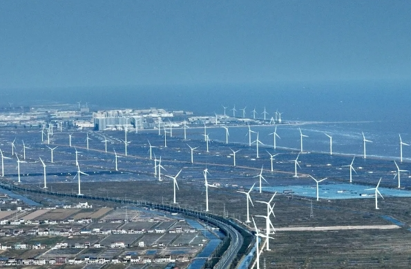 啟東擁有豐富的沿海風(fēng)能資源,海上風(fēng)電產(chǎn)業(yè)是啟東市新能源布局的重要一級。在近海海域,百米高的白色風(fēng)機(jī)迎風(fēng)轉(zhuǎn)動,葉片劃破海風(fēng)發(fā)出低沉轟鳴,這是啟東海上風(fēng)電的“能量動脈”。一季度,這片風(fēng)機(jī)矩陣已輸送綠電6.03億千瓦時,日均發(fā)電量可滿足3.58萬戶家庭月用電需求,相當(dāng)于年減碳49.9萬噸。