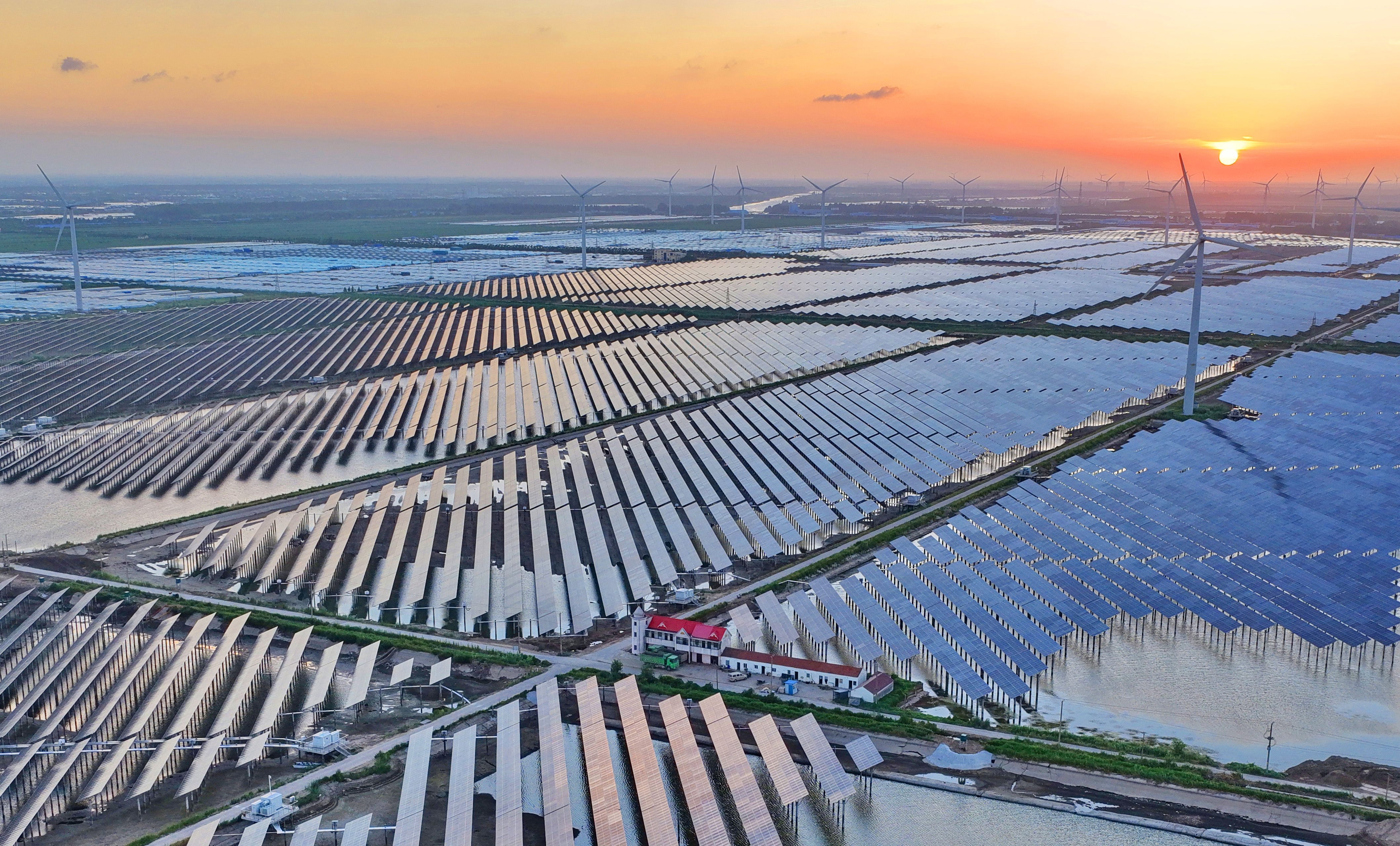 頂部23日拍攝的由中建三局總承包公司承建的南通市最大單體漁光互補(bǔ)光伏項(xiàng)目如東凌洋農(nóng)場(chǎng)漁光互補(bǔ)光伏發(fā)電項(xiàng)目一標(biāo)段。記者從國(guó)網(wǎng)南通供電公司了解到,截止到今年6月末,南通新能源累計(jì)發(fā)電量突破1000億千瓦時(shí),達(dá)到1085.88億千瓦時(shí)。 記者 許叢軍攝