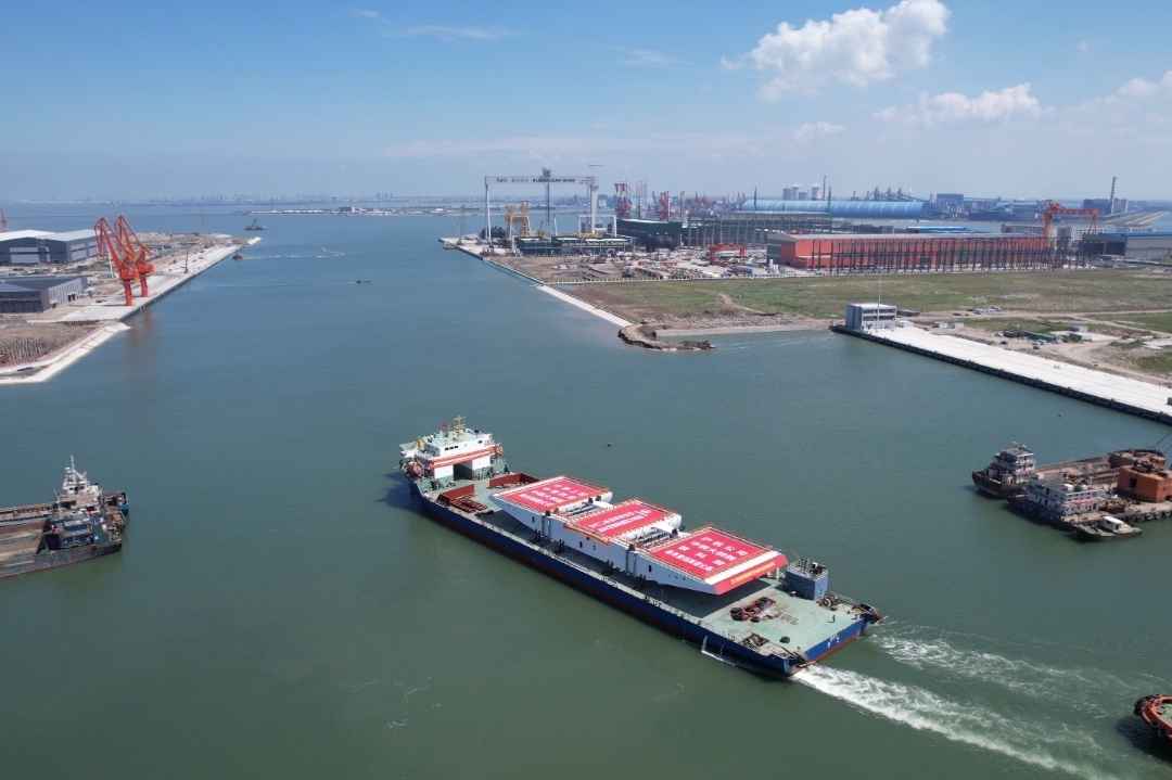 7月13日,載有甬舟鐵路西堠門公鐵兩用大橋金塘島側(cè)首段1100噸鋼箱梁的“海德利”輪緩緩駛離中鐵四局通州灣智能制造基地碼頭,標志著這座目前世界橋梁建設領域控制因素最復雜、工程技術難度最大的超級跨海大橋全面進入主體結(jié)構安裝施工階段。這不僅彰顯了通州灣高端裝備制造的實力,更為區(qū)域海工裝備產(chǎn)業(yè)集群發(fā)展提供了新支撐。