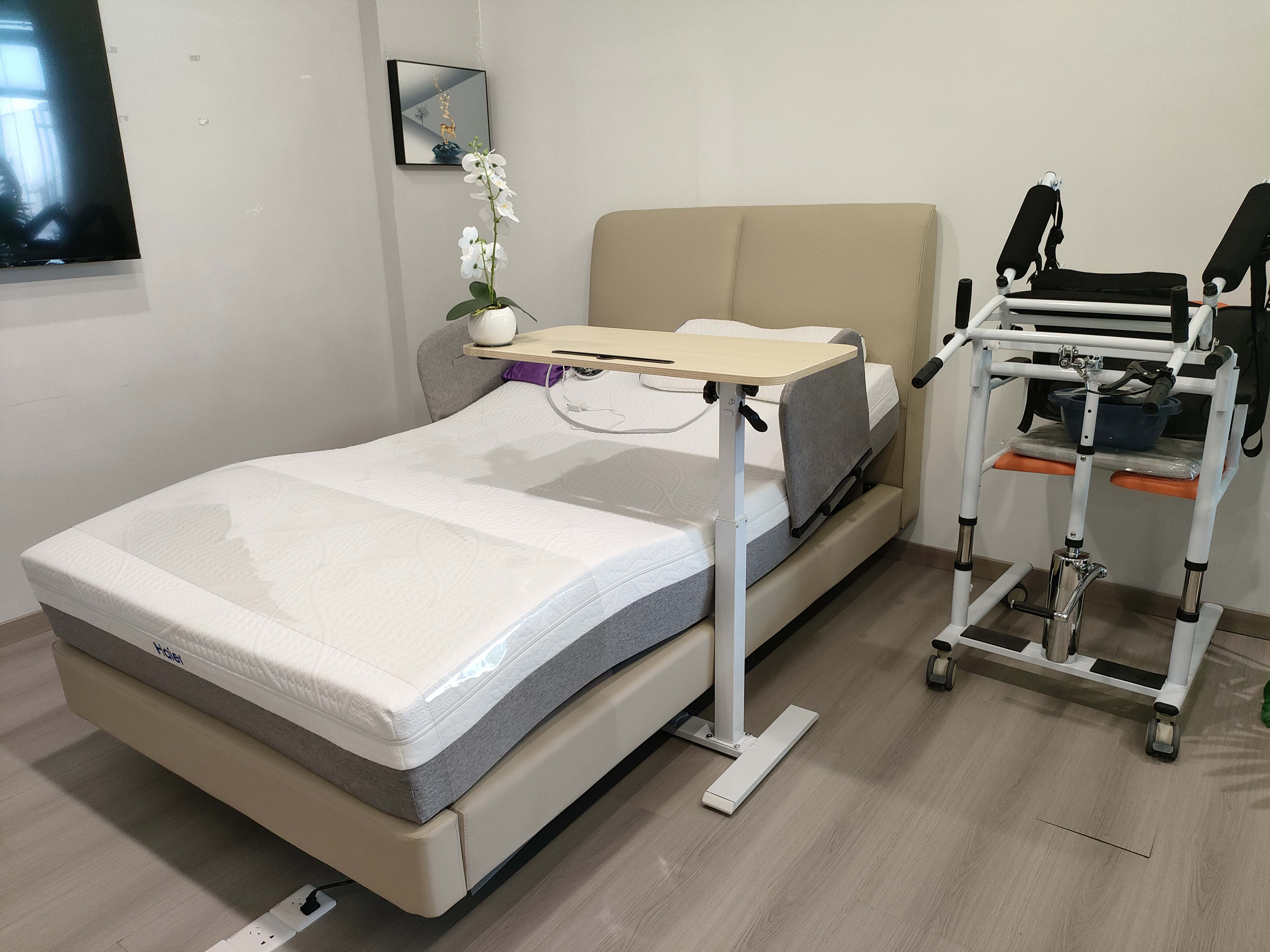 “單護理床就有6款,從手搖到半自動、全智能再到帶助眠等特殊功能的,老人可先體驗,再按需選購?!必撠?zé)人印鵬飛指著一款全智能護理床介紹,很多老人下床不便,即便有子女在一旁輔助,也很吃力,這款護理床可以搖高后旋轉(zhuǎn),實現(xiàn)輕松下床。