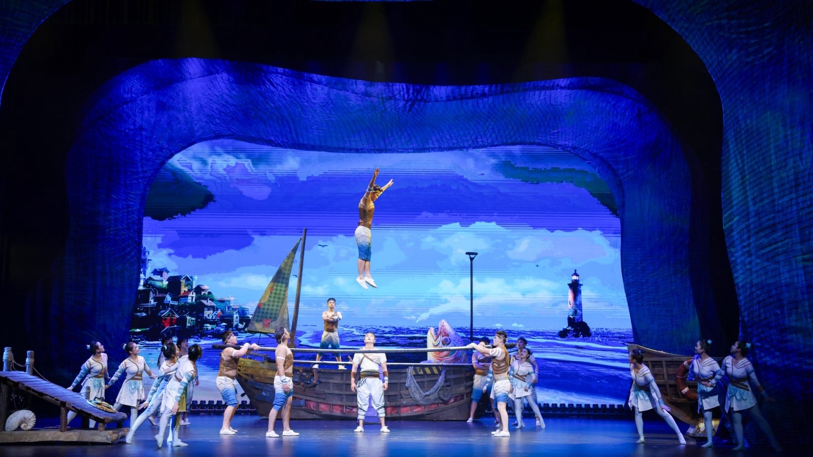 《尋夢(mèng)出海記——大海小海》是一部具有濃厚地域文化特色的藝術(shù)精品。該劇以如東沿海漁民故事為藍(lán)本,緊扣海洋生態(tài)保護(hù)主題,講述了海邊少年小海為拯救海洋生靈勇敢追夢(mèng)的故事。演出中,演員們以高難度雜技動(dòng)作詮釋角色成長(zhǎng),用魔術(shù)技巧演繹絕境求生,將如東非遺“跳馬伕”與現(xiàn)代舞融合,借助光影、音效及多媒體技術(shù),讓觀眾沉浸海洋世界,在視覺震撼之余感受生態(tài)環(huán)境保護(hù)的深意。