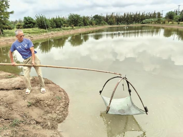 說(shuō)起眼前這片塘,楊池平感慨良多。16年前,黃海公路穿村而過(guò),村北原先半荒蕪的4條臟亂水溝,因公路取土被拓展成長(zhǎng)百余米、寬40多米的大水塘。于是,當(dāng)年56歲、原先在上海郊區(qū)包塘養(yǎng)魚(yú)的楊池平以每畝水面400元/年、塘周邊生產(chǎn)用地每畝1050元/年的租金,包下這片總32畝的水面及10多畝用地。