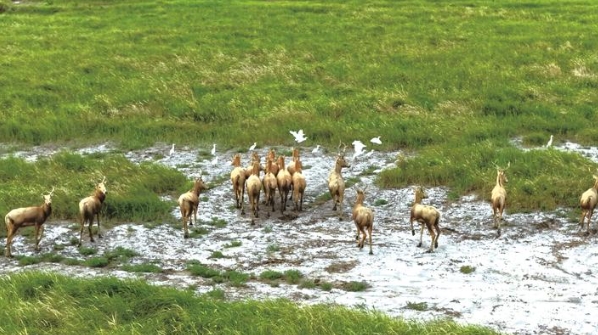昨天在如東小洋口風(fēng)景區(qū)拍到的野生麋鹿群。2023年2月,如東地區(qū)首次出現(xiàn)成群的野生麋鹿。2年多后,麋鹿群的數(shù)量已從最初的30余頭增長(zhǎng)至目前的上百頭。 錢咸華攝