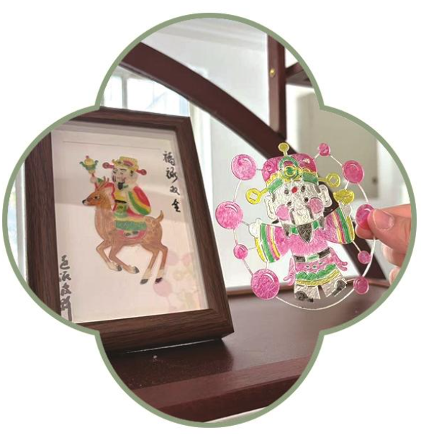 館內(nèi)百余平方米的創(chuàng)意空間陳列有一系列“可觀、可感、可觸摸”的精美產(chǎn)品和體驗項目,生動呈現(xiàn)中華優(yōu)秀傳統(tǒng)文化在當(dāng)代的創(chuàng)新傳承。率先映入眼簾的是運用通派皮影技藝制作而成的各類文創(chuàng)產(chǎn)品;除了傳統(tǒng)人形皮影,“十二生肖”“福祿壽喜”“梅蘭竹菊”系列相框擺件,以及精巧的耳飾、書簽等,展現(xiàn)出傳統(tǒng)工藝的多樣可能。一旁的表演互動區(qū)搭建起皮影戲臺,讓市民在家門口就能欣賞皮影演出。觀眾除觀演外,還可親手參與皮影制作,從刮磨牛皮、雕刻圖樣到敷彩綴結(jié),全程感受這項傳統(tǒng)手工藝的匠心獨運。