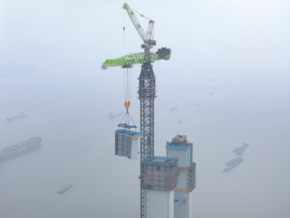 昨天,張靖皋長江大橋南航道橋南主塔進行第26個節(jié)段施工,主塔升至300米的新高度。張靖皋長江大橋連接蘇州張家港、泰州靖江和南通如皋三市,跨江段全長約7.9公里,大橋預(yù)計2028年完工。 記者 許叢軍攝